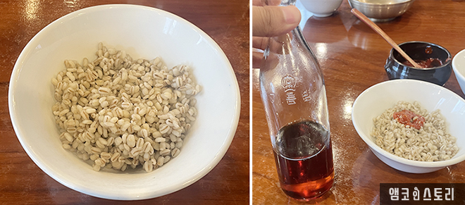 이 식당에서 반가운 점은, 메인 음식이 나오기전에 이 보리밥을 미리 먹을 수 있다는 점인데요, 고슬고슬한 보리밥에 고추장과 참기름을 쓱쓱 넣어 비벼 먹으니, 기다리는 동안 입맛도 돋고 기분도 한결 좋아졌습니다.