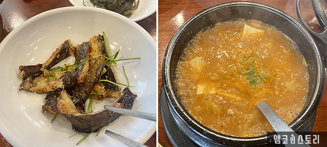 필자가 제일 좋아하는 반찬은 바로 가지튀김과 깻잎 무침입니다. 가지튀김은 바삭하면서도 속은 부드러워 입맛을 확 사로잡았고, 깻잎무침은 적당히 자극적이면서도 향긋한 맛이 더해져서 완전 밥도둑입니다. 그리고 청국장이 정말 맛있는데요, 두부도 푸짐하게 들어가 있어서 구수한 맛이 깊고 속이 확 풀리는 느낌이 듭니다. 더운 날씨에 속이 편안해지는 그런 맛이었습니다.