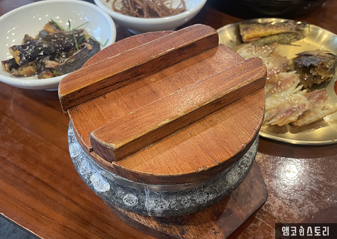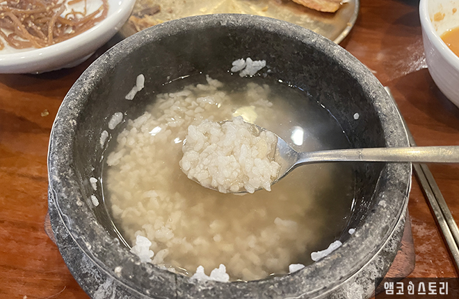 함께 나온 솥밥도 갓 지은 밥이라 그런지 아주 따뜻하고 고슬고슬한 식감이 살아있습니다. 밥그릇에 적당히 덜어낸 후 남은 밥과 누룽지에 따뜻한 물을 부어 숭늉으로 즐길 수 있는 점도 특별했습니다. 고소한 누룽지가 입안을 감싸면서 마무리까지 든든하고 편안한 느낌을 줘서, 식사를 더욱 풍성하게 해주었습니다.
