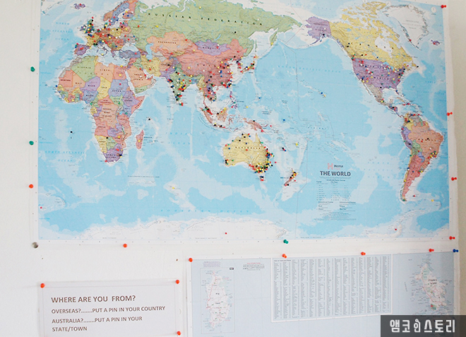 바로 아래쪽을 보니 관광객들에게 어디서 왔는지 핀으로 표시해 달라는 문구가 보인다. 세계지도에 꽂힌 많은 핀들은 관광객들이 꽂아놓고 간 것이다.