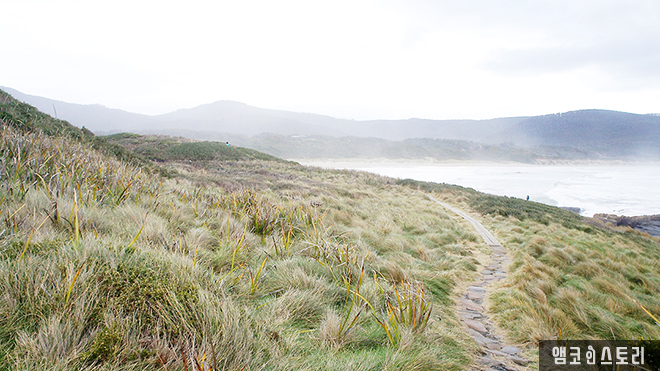 해변을 걷는 오솔길과 이름 모를 갈대 풀들이 너무 예뻐 사진에 담아 본다. 멋진 바다와 파도. 파도가 해변에 부딪치며 만들어내는 물방울들이 세찬 바닷바람에 실려 해변으로 날아든다. 마치 옅은 안개가 감싸는 듯 보이는 Adventure bay beach!