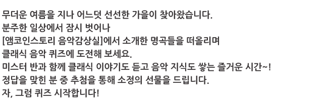 | 앰코인스토리가 맞은 가을! 클래식 음악 감상 퀴즈 결과 발표 _ 웹진 [앰코인스토리] (3) | 2025.09.26 |