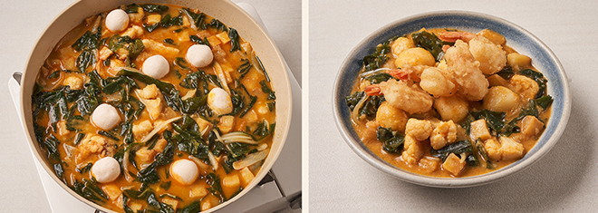 ⑤ 커리 소스, 물(1/2컵=100g), 넣고 옹심이를 넣고 3분 동안 끓인다.