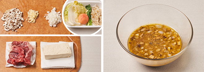 ① 표고버섯, 양파, 마늘은 다지고, 끓는 물에 배추, 숙주, 청경채를 데친다. 토마토는 껍질을 벗기고, 소고기는 키친타월로 핏물을 제거하고 두부는 물기를 제거한다.