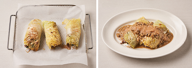 ⑤ 종이포일에 올리브유(20g)를 뿌리고, 데친 배추를 올린 후 위에 구운 고기와 덕셀(30g)을 올리고 돌돌 말아 에어프라이어에 200도, 10분간 굽는다.