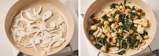④ 컬리플라워, 감자튀김, 불린 미역을 3분 동안 더 볶는다.