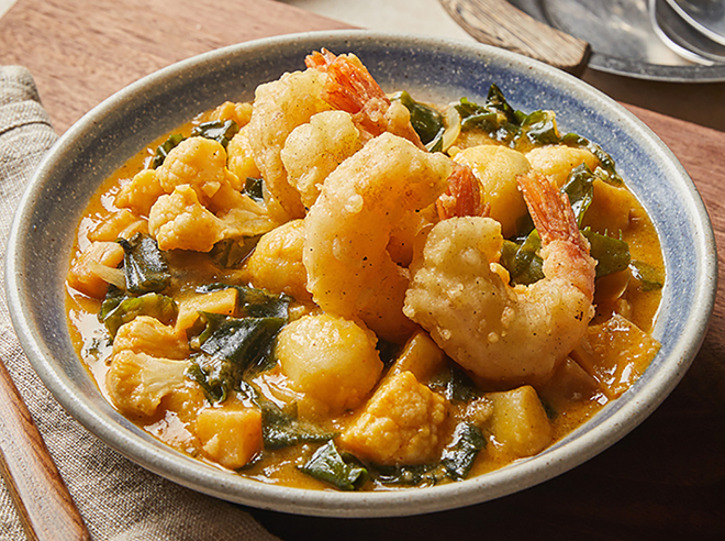커리 소스(80g), 홍새우 튀김(150g), 컬리플라워(50g), 감자튀김(100g)