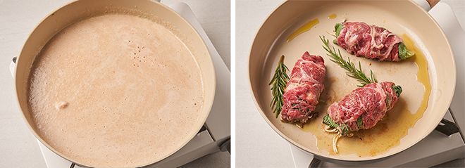 ④ 소고기에 머스타드, 덕셀(30g)을 바르고 깻잎, 두부, 숙주, 청경채를 넣어 말아 감싸준 후 소금(5g), 후추를 뿌리고, 달군 팬에 올리브유 (20g)를 두르고 소고기를 굽고, 로즈메리를 넣어 고기에 향을 입힌다.