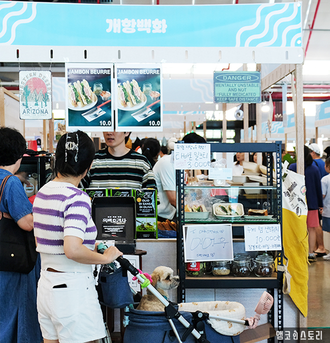 본격적인 마켓 투어는 1층부터 시작해 2층으로 이어지는 동선을 계획했습니다. 1층은 그야말로 맛있는 냄새로 가득한 미식의 세계였습니다. 인천 로컬 맛집들이 각자의 개성 있는 음식과 음료를 늘어놓았는데, 그중에서도 유독 반가운 이름이 눈에 띄었습니다. 바로 일전에 소개했던 '인천 개항백화'의 잠봉뵈르 샌드위치! 개항로의 개성 넘치는 공간, 개항백화는 레트로한 감성과 진정성 있는 맛으로 사랑받는 곳인데, 다시 만나니 더욱 반가웠습니다. 짭조름한 잠봉과 고소한 버터, 바삭한 바게트의 조화는 여전히 일품이네요.