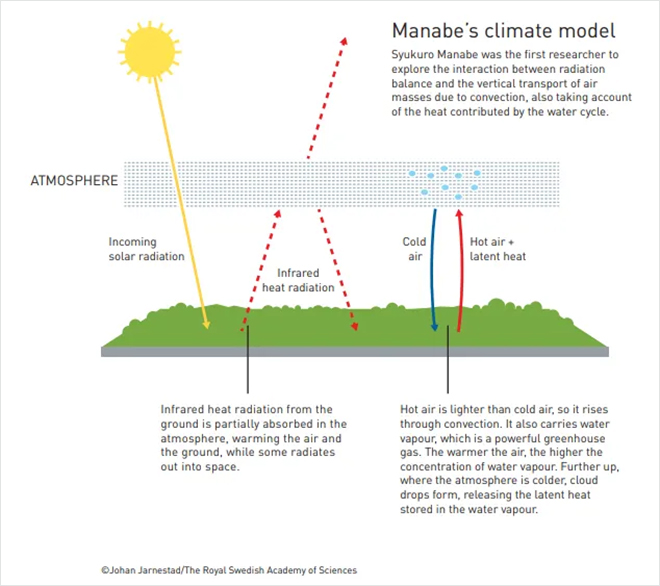 현대 기후 모델의 아버지로 불리는 마나베 슈쿠로 교수는 1960년대 후반, 당시로서는 획기적인 컴퓨터 시뮬레이션을 통해 대기 중 이산화탄소 농도가 두 배가 되면 지구 평균 기온이 약 2℃ 상승한다는 정량적 결과를 세상에 내놓았습니다. 이는 단순한 예측이 아니라, 복사 평형, 대류, 지표와 대기 간 에너지 흐름 등을 수치적으로 계산한 세계 최초의 기후 모델로, 이후 그는 3차원 기후 모델을 개발해 북극 지역의 온도 상승, 성층권 냉각 등 현재 관측되고 있는 복잡한 기후 현상을 예측해냈습니다.