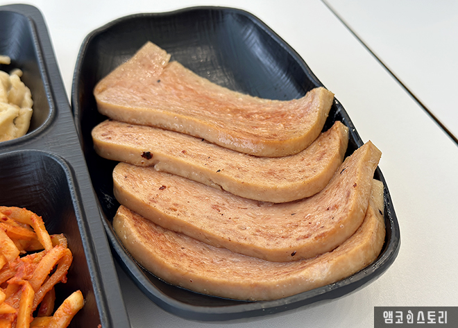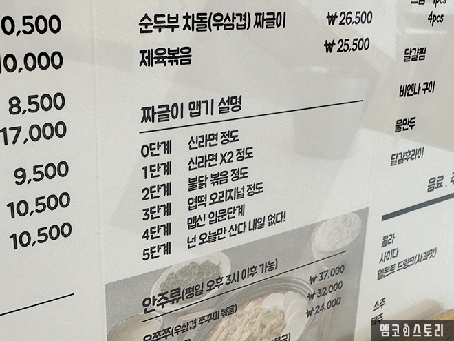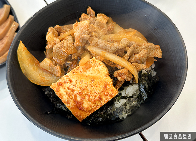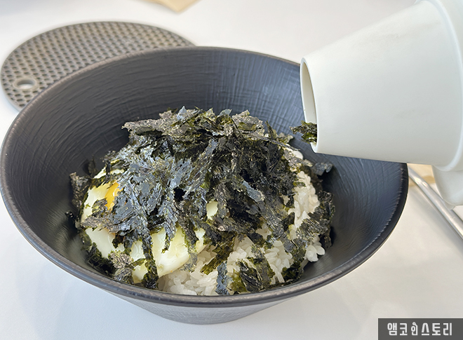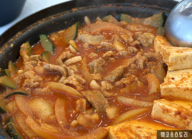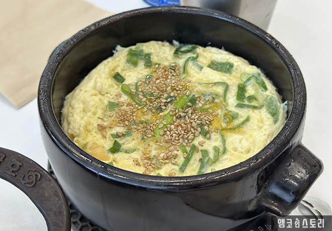 필자는 친구와 함께 방문해 돼지 짜글이 2인 세트에 사이드로 계란찜과 스팸 네 조각을 추가했어요. 짜글이는 맵기 조절이 가능한데, 필자는 ‘신라면 2배 맵기’ 정도로 요청했답니다. 실제로 먹어 보니, 너무 맵지 않고 칼칼해서 밥과 궁합이 정말 잘 맞았어요. 고기도 넉넉하게 들어있고 국물은 밥 비벼 먹기 딱 좋은 농도였습니다. 짜글이 국물에 김가루까지 솔솔 뿌려주면 밥 한 공기는 그냥 뚝딱이지요.