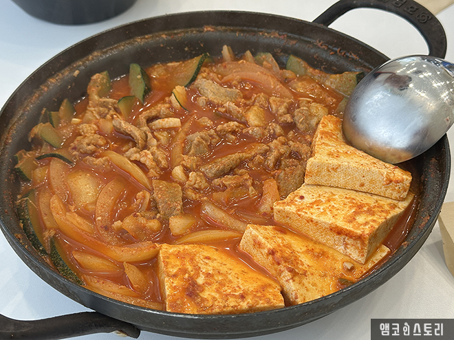 필자는 친구와 함께 방문해 돼지 짜글이 2인 세트에 사이드로 계란찜과 스팸 네 조각을 추가했어요. 짜글이는 맵기 조절이 가능한데, 필자는 ‘신라면 2배 맵기’ 정도로 요청했답니다. 실제로 먹어 보니, 너무 맵지 않고 칼칼해서 밥과 궁합이 정말 잘 맞았어요. 고기도 넉넉하게 들어있고 국물은 밥 비벼 먹기 딱 좋은 농도였습니다. 짜글이 국물에 김가루까지 솔솔 뿌려주면 밥 한 공기는 그냥 뚝딱이지요.