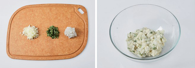 ① 양파와 깻잎은 곱게 다지고, 칵테일새우는 깨끗하게 씻은 뒤 곱게 다진다.