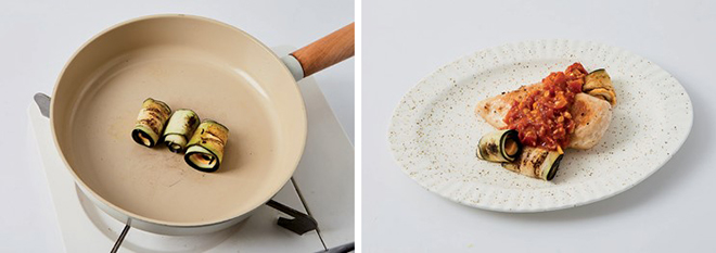 ⑤ 가지는 길고 납작하게 썰어 펼치고, 치즈를 위에 올려 돌돌 만 뒤 팬에 살짝 굽는다.