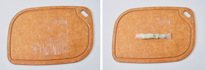 ④ 지퍼백에 새우반죽을 넣은 뒤 가위로 끝부분을 잘라 라이스페이퍼 위에 반죽을 짜 올리고, 돌돌 말아 새우소시지를 만든다.