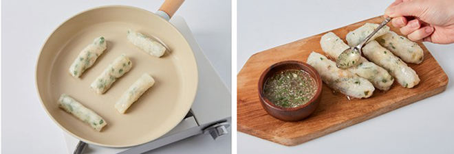 ⑤ 중간 불로 달군 팬에 식용유를 둘러 새우소시지를 올린 뒤, 겉면이 하얗게 변할 때까지 노릇하게 굽는다.