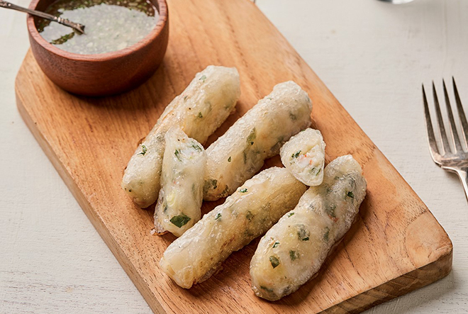 소시지는 고대 그리스 시대부터 시작되어 로마와 유럽 전역으로 퍼졌으며, 향신료의 도입과 함께 다양한 형태로 발전해온 오랜 전통의 육가공 음식입니다. 수제새우소시지는 시중 소시지와 달리 인공 첨가물 없이 순수한 새우와 채소로 만든 건강한 요리입니다. 곱게 다진 칵테일새우와 양파, 깻잎(선택)을 감자전분과 마늘 등으로 간을 한 뒤, 라이스페이퍼에 말아서 구워내는 방식으로, 겉은 바삭하고 속은 촉촉한 식감을 자랑합니다. 특히, 깻잎의 은은한 향이 새우의 감칠맛과 잘 어우러지며, 올리고당과 다진 마늘로 만든 소스는 고소하면서도 단맛을 더해줍니다.