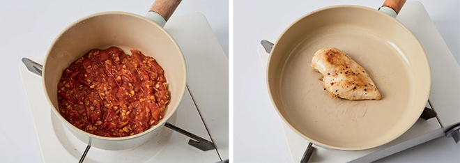 ③ 다진 방울토마토와 마늘은 냄비에 넣어 볶고, 물(45ml)과 오레가노를 넣고 끓여 소스를 만든다.