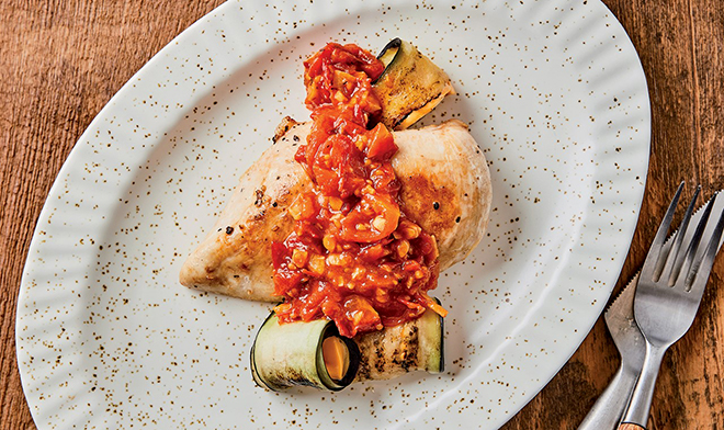 닭가슴살 스테이크는 가지와 방울토마토, 마늘을 곁들여 구운 후, 오레가노로 향을 더한 토마토 소스를 얹어 만들었습니다. 오레가노 허브는 주로 그리스 요리와 튀르키예 요리에서 사용하는 것으로 지중해풍의 감성을 느낄 수 있습니다. 특히, 치즈를 얹은 구운 가지는 식감과 고소함을 더해 닭가슴살의 담백함과 훌륭한 조화를 이룹니다. 고단백 저지방인 닭가슴살은 다이어트에 좋고, 항산화 성분이 풍부한 방울토마토는 면역력 향상에도 도움을 줍니다.