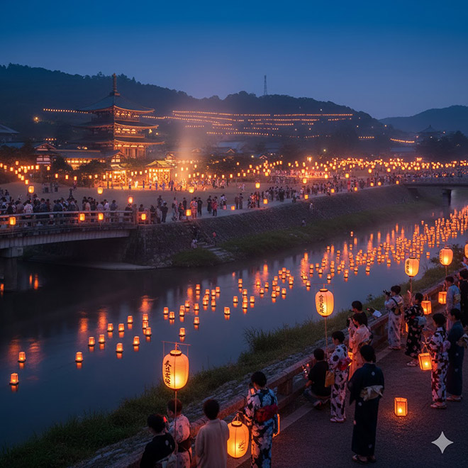 원래 오봉은 음력 7월 15일이었으나 일본도 양력을 도입한 이후에는 이 명절을 지역에 따라 세 가지의 다른 시기로 보냅니다. 기존의 음력 7월 15일이 오봉인 도쿄를 비롯한 관동 지역, 양력 8월 15일이 오봉은 대부분의 일본 지역(오사카, 후쿠오카, 나고야), 음력 7월 15일이 오봉인 오키나와, 가고시마현 등으로 나뉩니다.