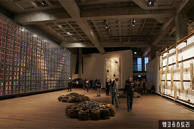 아래 사진 왼쪽 벽에 있는 작품이 시드니 놀란(Sidney Nolan)이라는 작가의 작품 <뱀(Snake)>이다. 1,620장의 그림으로 움직이는 뱀을 표현했다고 한다. 오른쪽에는 마치 교수형에 사용할 법한 굵은 밧줄을 매달아 놓은 작품도 있다.