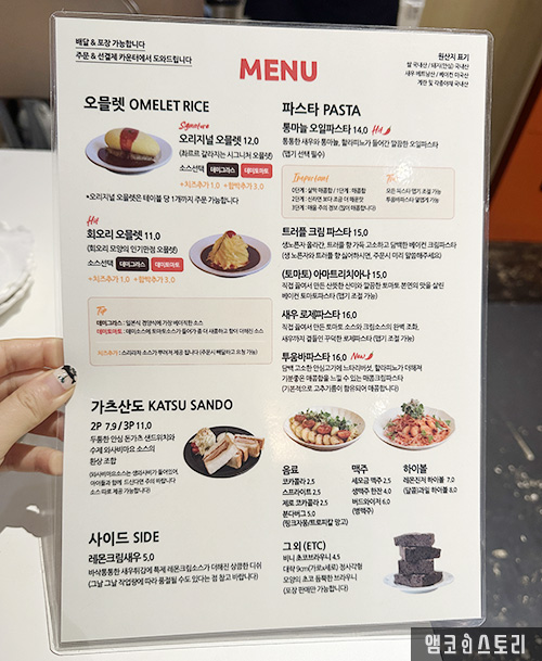 필자는 친구와 함께 방문해 시그니처 오믈렛, 촉촉한 가츠산도, 사이드 레몬크림새우를 주문했답니다.