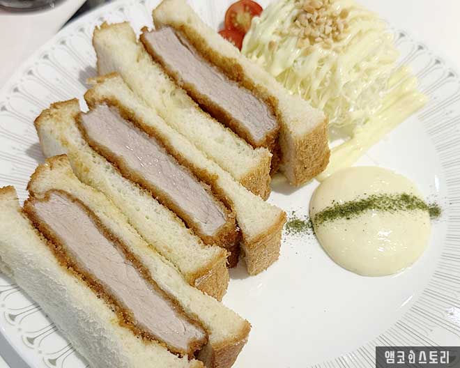 가츠산도는 두툼한 안심 돈가츠에 와사비마요소스가 더해져 느끼하지 않고 깔끔했어요. 한 입 베어 물 때마다 바삭한 안심 돈가츠와 식빵이 일본에서 먹는 돈가츠샌드위치가 절로 생각났습니다.