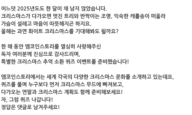 | 크리스마스의 추억을 소환하는 연말 땡땡 퀴즈 결과 발표_ 웹진 [앰코인스토리] (1) | 2025.12.24 |