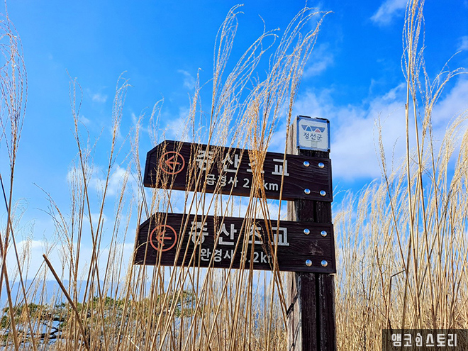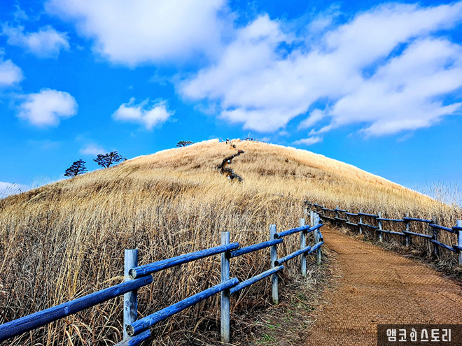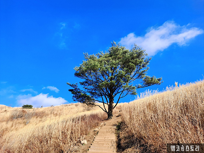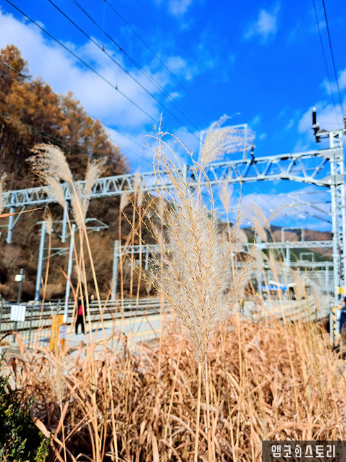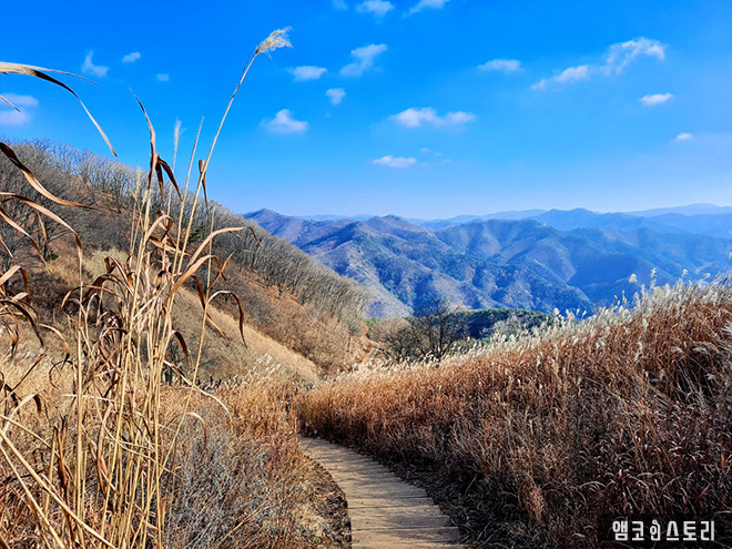 억새 시즌이 살짝 지난 민둥산은 또 다른 색깔의 옷으로 갈아 입고 있는 중입니다. 겨울을 목전에 둔 만추의 바람은 억새꽃을 살짝만 스쳐도 금빛 파도가 일렁입니다. 능선을 타고 내려오는 바람에, 길 양쪽으로 서 있는 억새들이 몸을 기대어 흔들리며 마치 산객을 환영하듯 살짝 머리를 숙입니다. 가까이 다가가면 은빛으로 멀리서 바라보면 금빛으로 금은보화의 조화가 따로 없습니다. 파란 하늘과 금빛 능선 산그리메를 배경삼아 늦가을의 향취에 젖어 봅니다.