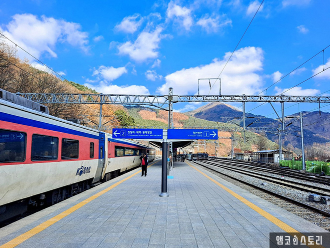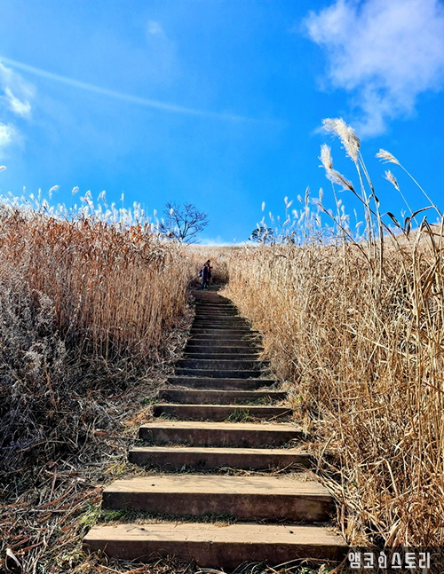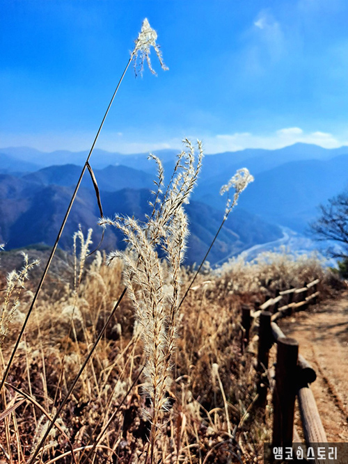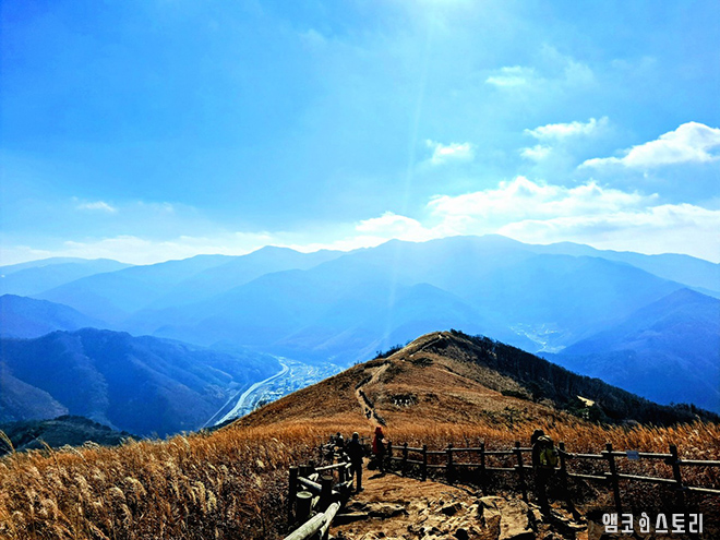 억새 시즌이 살짝 지난 민둥산은 또 다른 색깔의 옷으로 갈아 입고 있는 중입니다. 겨울을 목전에 둔 만추의 바람은 억새꽃을 살짝만 스쳐도 금빛 파도가 일렁입니다. 능선을 타고 내려오는 바람에, 길 양쪽으로 서 있는 억새들이 몸을 기대어 흔들리며 마치 산객을 환영하듯 살짝 머리를 숙입니다. 가까이 다가가면 은빛으로 멀리서 바라보면 금빛으로 금은보화의 조화가 따로 없습니다. 파란 하늘과 금빛 능선 산그리메를 배경삼아 늦가을의 향취에 젖어 봅니다.