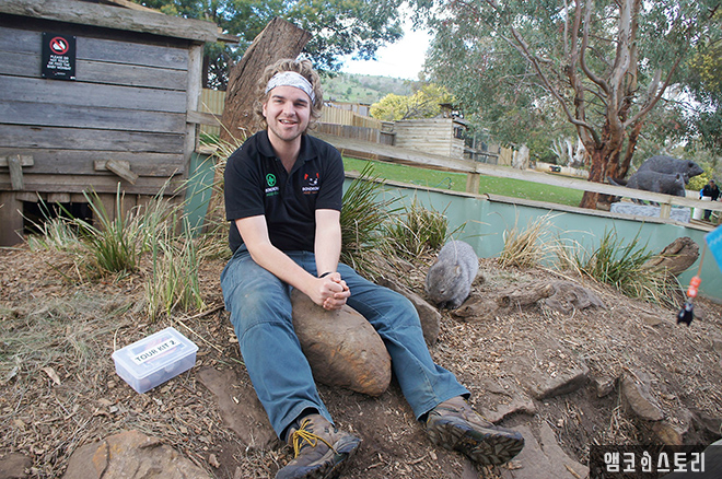 드디어 투어가 시작된다. 돌보고 있는 아기 동물들을 보여주고, 먹이도 주고, 동물에 대한 이야기를 들려주는 투어다. 잘생긴 호주 청년이 안내를 맡았는데, 자기 소개를 마친 후에 아기 웜뱃이 있는 우리로 갔다. 필자도 궁금하여 웜뱃이라는 동물에 대해 좀 자세히 알아보았다.