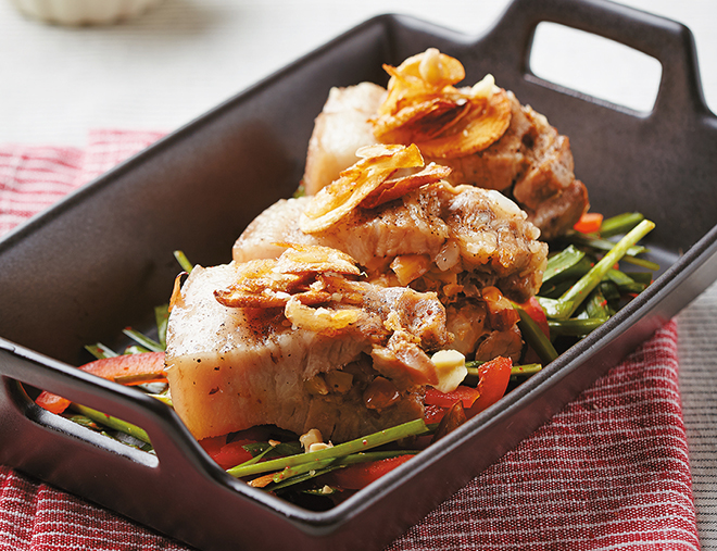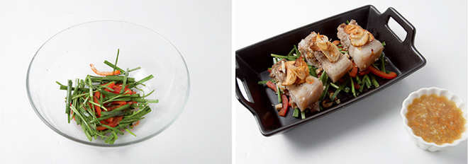⑥ 통삼겹살을 먹기 좋은 크기로 썰어 부추, 파프리카 위에 놓고 튀긴 새우젓과 마늘을 올린 뒤 소스를 곁들여 마무리한다.