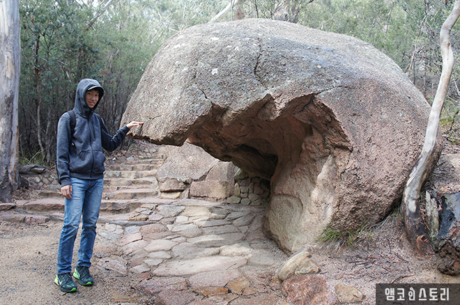 산 정상을 보면, 마치 돌을 쌓아 만든 커다란 성벽처럼 보이기도 한다. 산책로 곳곳에 보이는 둥글둥글한 큰 바위들은 아마 저 꼭대기에서 아래로 굴러온 것들이리라.
