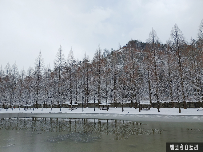 하얀 눈이 덮인 메타세쿼이아길. 길게 뻗은 나무들은 하얀 옷을 입고 고요히 서 있고, 그 사이로 이어진 길은 순백의 세계를 자랑합니다. 고요함이 마음 깊숙이 스며들고, 잠시 바쁜 일상에서 잠시 벗어나 자연이 주는 평온을 느끼며 오늘은 걷는 것만으로도 행복합니다.
