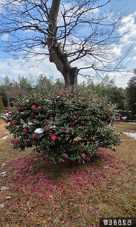 신안 압해도 1004섬 분재공원의 3km에 이르는 애기동백 숲길에는 2만 그루의 애기 동백나무가 자태를 뽐내고 있습니다. 눈 내린 겨울에 보는 꽃이 드문데, 빨간빛 동백이 반짝이는 모습은 마치 바다 위 붉은 융단 같았고, 그 풍경은 겨울이 주는 삭막함과 대비되어 더 큰 감동을 주었습니다.