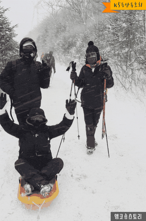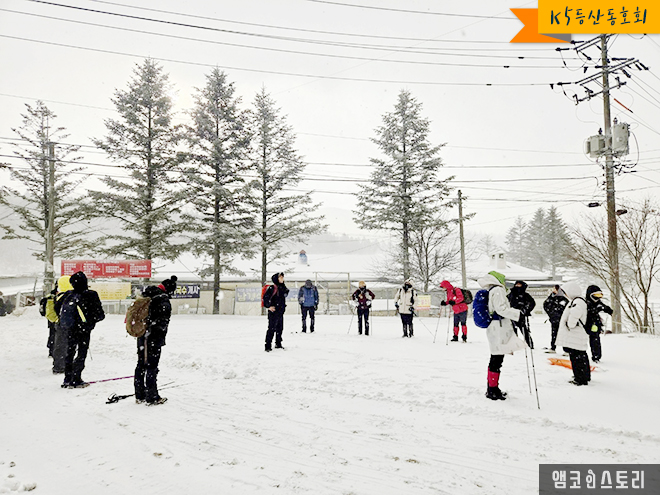 이미 대관령 마을 휴게소의 그 넓은 주차장이 눈꽃 산행을 하려는 산객들로 인산인해입니다. 사람들의 마음은 다 같은 것 같습니다. 아마도 오늘 이곳에 대설주의보가 내린 걸 보고 새벽같이 달려온 것 같군요. 하늘에선 계속 눈이 내리고, 이미 도로와 탐방로 주변은 눈이 수북이 쌓였습니다. 기대 반 우려 반이 되는 마음으로 각자가 준비한 방한용품과 안전용품을 꺼내어 산행 준비를 합니다. 아이젠, 등산 스틱, 스패츠, 방한모자, 우의, 핫팩 등등, 배낭이 꽉 차도록 준비한 각종 장비로 중무장 완료! 철저한 준비가 편안하고 안전한 산행을 보장하기에 겨울 산행은 대충할 수 없는 것이지요.