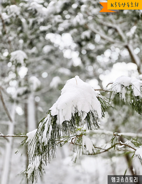 선자령은 크게 세 개의 탐방로가 있는데, 오늘은 임도를 따라 국사 성황사를 거쳐 전망대와 정상석을 찍고 계곡길을 따라 양떼 목장으로 내려오는 12km 정도의 코스로 산행 계획을 세웠습니다. 출발지에서 잘 정비된 임도를 따라 30분 정도 가다 보면 국사 성황사가 나옵니다. 이 임도길이 오늘 같이 대설이 내리는 날이면 아주 멋진 풍경을 보여줍니다. 길 양쪽으로 촘촘히 식재된 소나무에 쌓인 설경이 크리스마스 트리를 생각나게 하지요. 마치 북유럽의 어느 숲을 연상케 하는 모습을 자아냅니다. 감성이 별로 없는 사람도 감성을 자극하게 만드는 환상의 설경이 바로 이곳입니다.