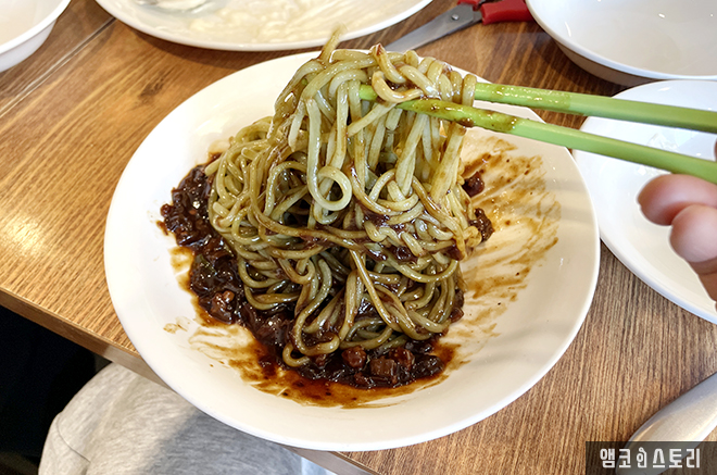 유니짜장은 주문과 동시에 가장 눈길을 끌었던 메뉴였습니다. 접시에 담긴 면이 일반 짜장면과 달리 은은한 초록빛을 띠고 있어 첫인상부터 호기심을 자극했는데요, 잘게 다진 고기가 소스에 고루 섞여 있어 면과 함께 비볐을 때 전체적으로 부드럽고 균형 잡힌 맛을 느낄 수 있었습니다. 짜장의 맛은 과하지 않고 담백한 편으로, 면과 소스가 자연스럽게 어우러지며 끝까지 질리지 않고 즐기기 좋았습니다. 시각적인 재미와 함께 기본에 충실한 맛을 동시에 느낄 수 있었습니다.