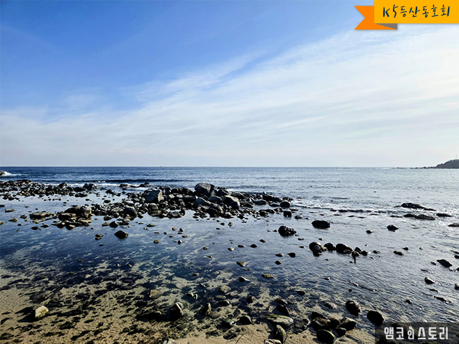 겨울철 동해안 지역은 북서풍의 영향으로 순 코스가 아닌 북쪽에서 남쪽으로 내려가는 역 코스로 트레킹을 하는 것이 바람의 영향을 덜 받아 힘도 덜 들고 덜 춥습니다. 오늘 이곳의 낮 기온은 0도. 필자가 믿는 구석이 있다고 서두에 말씀드렸던 것이 바로 이것이지요. 계절풍(북서풍)을 직접적으로 영향받는 서해안 인천 지역과 다르게 동해안은 백두대간의 큰 산맥이 바람을 막아주어 서해안보다 5도 이상의 따뜻한 기온을 나타내는 것이 겨울철 특징입니다. 바람의 방향과 지리적 기후의 특성까지도 철저히 계산하고 준비하면 혹한의 날씨에도 즐거운 트레킹을 즐길 수 있답니다. 오늘은 유독 하늘이 더 맑고 푸르게 보이고 바람도 거의 없어 마치 초봄의 날씨를 연상케 합니다.