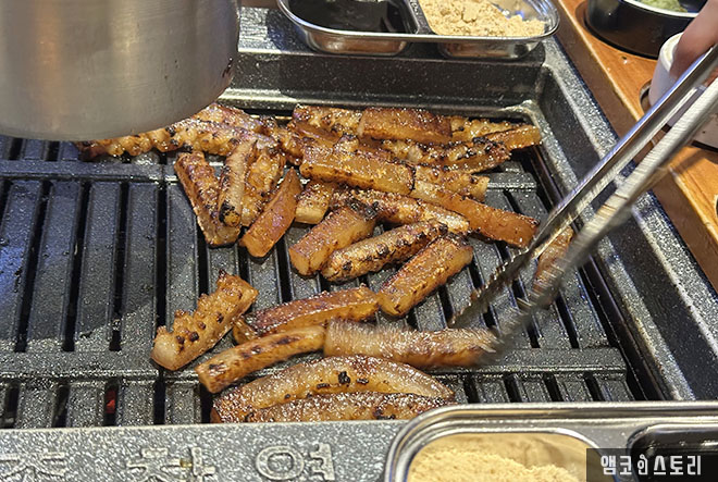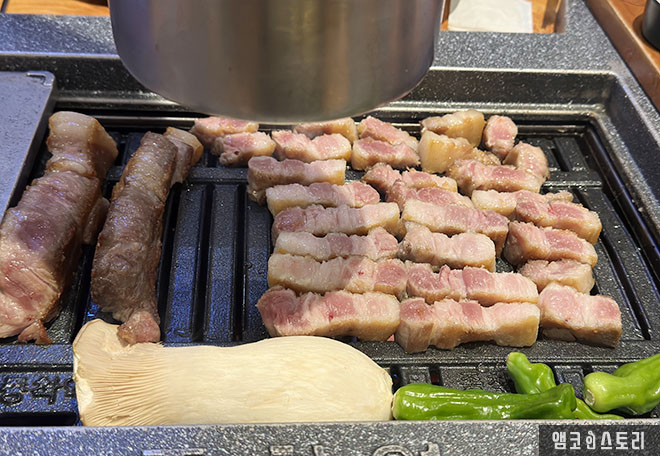 먼저, 종착역 마블 삼겹살은 마블링이 좋은 프리미엄 삼겹살을 사용해 육즙이 풍부하고 고소한 맛이 정말 좋았습니다. 불판 위에서 구워지는 고기의 고소한 향이 식욕을 자극했고, 한 입 먹는 순간 부드러운 식감과 진한 풍미가 느껴졌습니다.