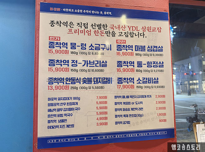 ✔️ 메뉴 : 종착역 마블 삼겹살 16900원, 종착역 뭉텅 소금구이 15,900원, 껍데기 7,900원