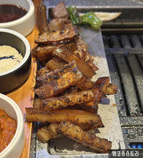 특히, 종착역의 시그니처 메뉴인 뭉텅 소금구이는 두툼하게 썬 국내산 목살을 안데스 소금으로 맛을 더한 메뉴인데요, 옛 방식으로 큼직하게 썰어 구워 먹는 스타일이라 고기의 육즙과 식감을 제대로 느낄 수 있었습니다.