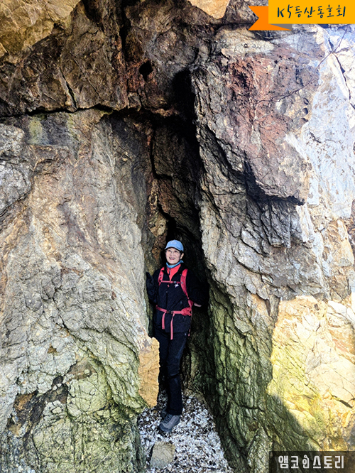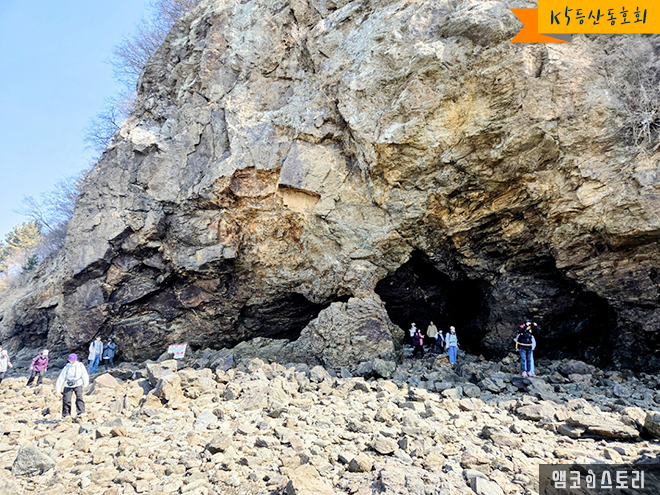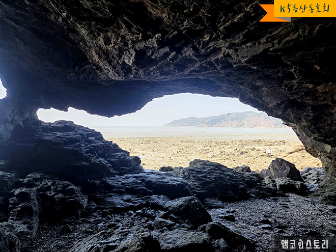 물이 빠지면 해안절벽의 기가 막힌 뷰가 모습을 드러내며 여행객들의 시선을 압도합니다. 수만 년의 파도를 맞으며 침식 작용이 만들어낸 해안의 기암 괴석과 동굴! 특이한 건, 밖에서는 동굴의 형태가 잘 드러나지 않습니다. 동굴 안에서 밖을 바라봐야만 비로소 그 멋진 모습이 나타나거든요. 두 개의 큰 구멍으로 이루어진 해식동굴인데, 마치 공룡과 너무 흡사하여 필자는 나름대로 공룡동굴이라 이름을 지었습니다. 이곳이야말로 장봉도의 매력에 화룡정점을 찍는 장소가 아닌가 싶습니다.
