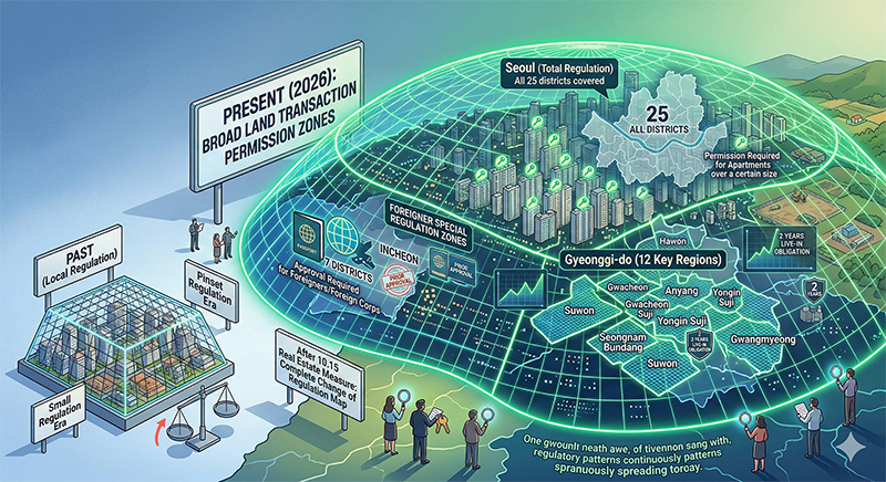 - 토지거래허가제 지역 : 현재 서울 25개 자치구 전역과 경기 남부 핵심 12개 지역(수원, 성남 분당, 안양, 용인 수지, 과천, 광명, 하남), 인천(외국인 특별 규제)