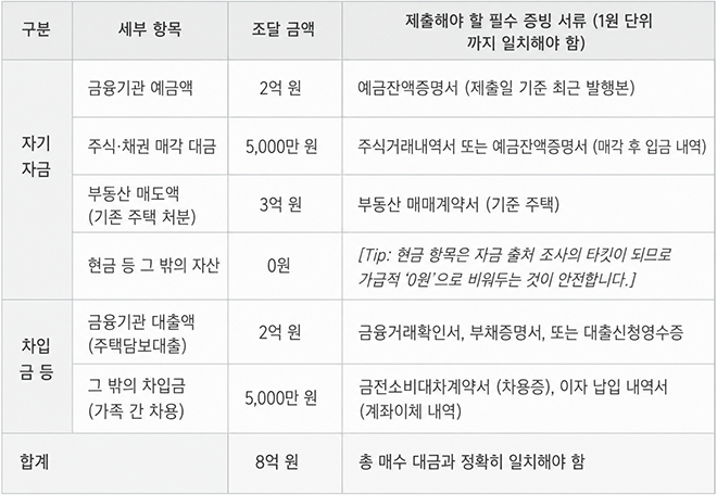 ‘서울 8억 원 아파트 매수 및 1주택자 갈아타기’ 상황을 가정하여, 지자체의 현미경 심사를 무사히 통과할 수 있는 모범 답안 형태로 작성했습니다. 옆에 적힌 ‘증빙서류’의 금액과 1원 단위까지 정확히 맞아 떨어져야 관할 구청의 허가 문턱을 넘을 수 있습니다.