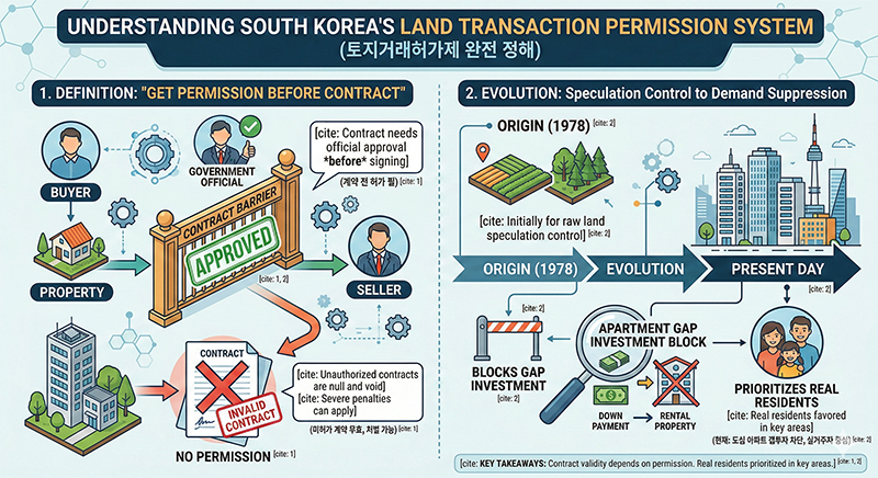 이 제도는 본래 1978년, 대한민국에 부동산 투기 열풍이 불던 시기 신도시나 산업단지 주변의 순수 ‘토지(농지, 임야)’ 투기를 막기 위해 탄생했습니다. 하지만 시대가 흐르며 그 쓰임새가 완전히 달라졌습니다. 현재는 도심 내 재건축 및 재개발 지역이나 집값이 급등하는 주요 핵심지의 아파트 갭투자를 원천 차단하고 실거주자 위주로 시장을 재편하기 위한 가장 강력한 수요 억제책으로 활용되고 있기 때문입니다.