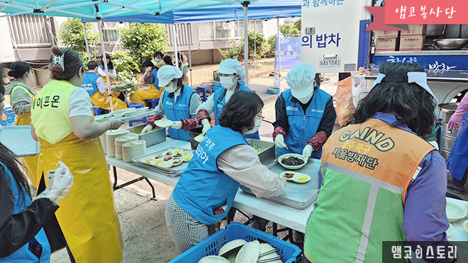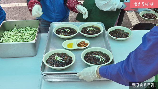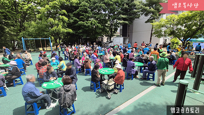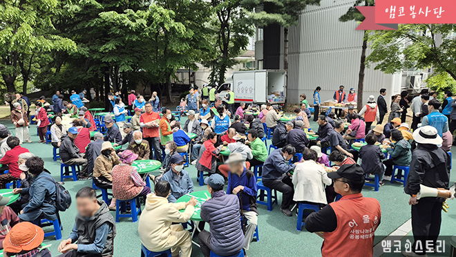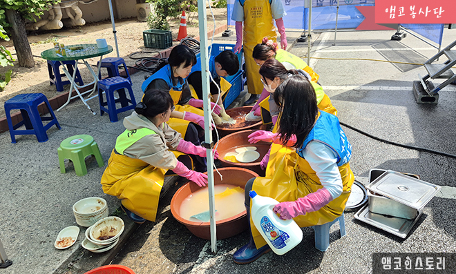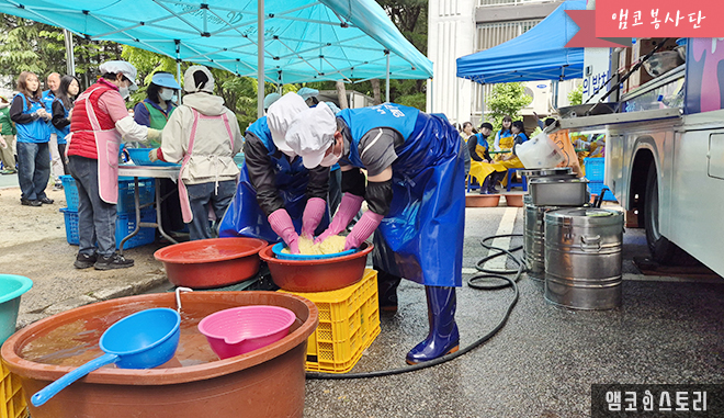 이날 봉사활동에 참여한 앰코코리아 앰코봉사단 20여 명은 이른 아침부터 현장에 모여 부스 설치부터 배식, 식사 후 환경정리를 펼쳤습니다.
