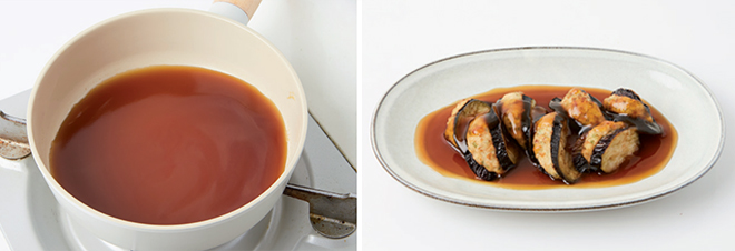 ⑤ 냄비에 가지소스 재료와 물(100㎖)을 넣어 4분간 끓인다.
