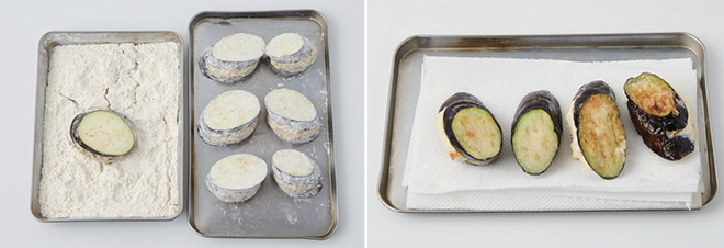 ③ 칼집을 넣은 가지에 밑간을 한 돼지고기를 채운 뒤 튀김가루를 묻힌다.