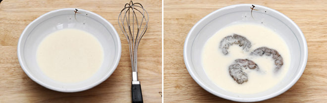 ④ 밑간을 해 놓은 새우를 튀김반죽에 넣어 옷을 입힌다.
